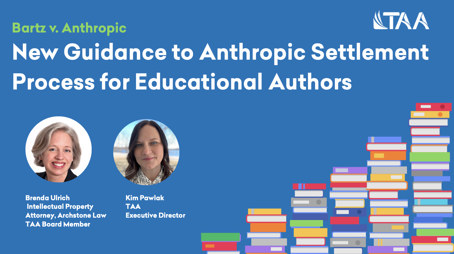 Attorney Brenda Ulrich and TAA Executive Director Kim Pawlak share an overview of TAA's new guidance for educational authors whose works are involved in the Bartz v. Anthropic Settlement but who are not eligible for the 50/50 default split, or for non-educational authors who chose to opt out of the 50/50 default split. This webinar covers:
