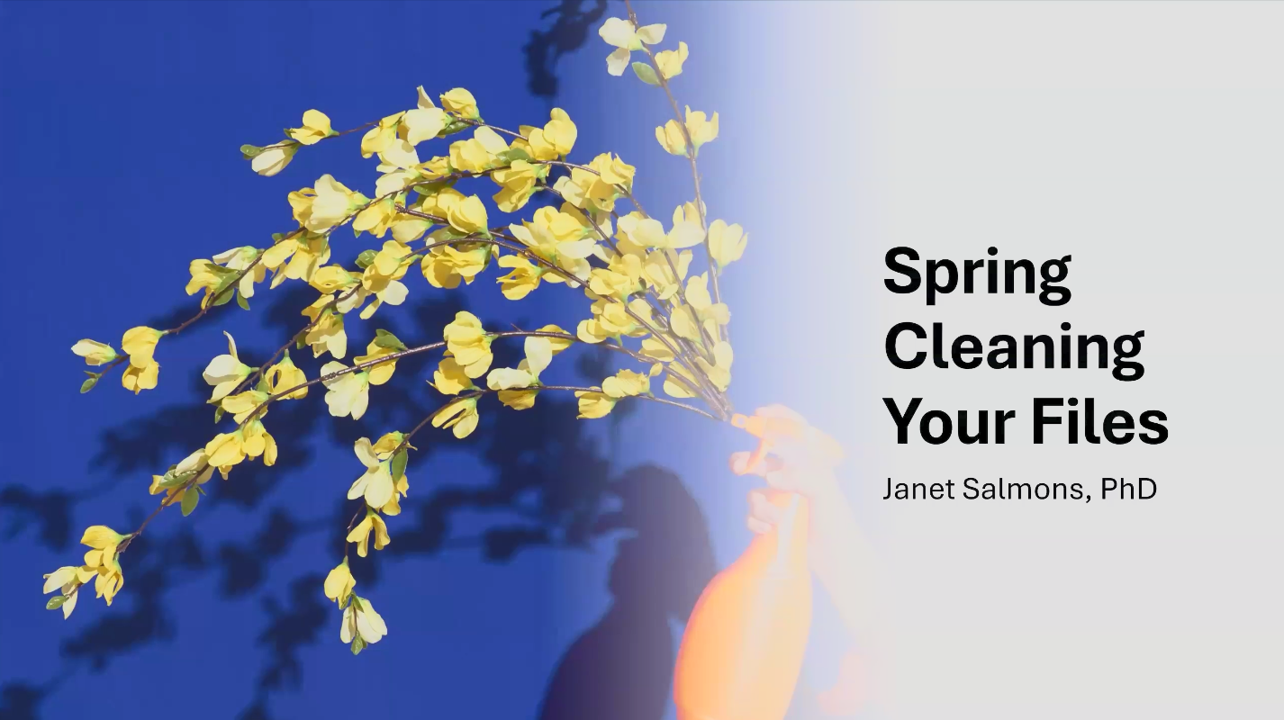 Join scholar, writer and coach Janet Salmons to learn how to better organize all those files you accumulate when working on your writing projects, including how to better label your files, how to determine what to delete and what to keep, and how to turn that unused content into blog posts, articles, and future projects.